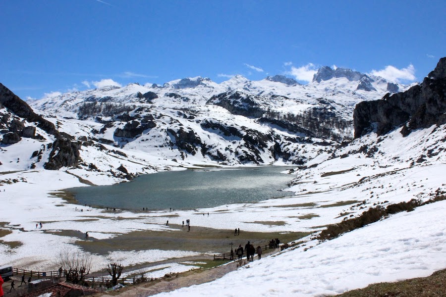 Desde allí, cogimos un autobús para subir a los lagos de Covadonga. Los lagos de Covadonga son dos lagos de origen glacial: el Enol y el Ercina. Están bastante cerca uno del otro y de hecho desde la cima de la montaña que los separa, puedes ver los dos a la vez. En esta época del año, estaba todo nevado y hacía un poco de frío. Pero, aunque pasamos frío merece la pena subir a verlos porque creo que es uno de los paisajes más bonitos que he visto.