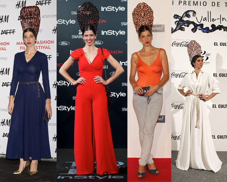 De izquierda a derecha: Madrid Fashion Film Festival ( noviembre 2014 ), fiesta del 10º aniversario de la revista Style España ( Madrid, octubre 2014 ), Vogue Fashion"s Night Out Madrid ( septiembre 2012 ), 8º Premios de Teatro Valle Inclán ( Madrid, abril 2014 ).