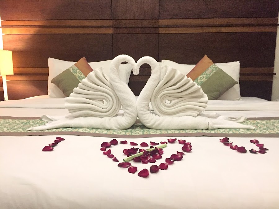Cuando llegamos al hotel tenían perfectamente decorada la habitación con dos cisnes y un corazón con pétalos de rosa, para felicitarnos nuestra luna de miel.