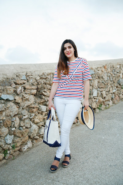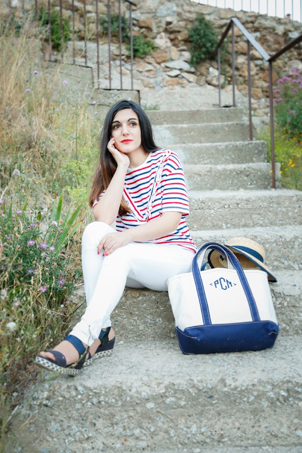 Como tuvimos que hacer un viaje en coche de ocho horas, me decanté por un outfit cómodo a la par que estiloso. Simplemente me puse unos jeans blancos, una camiseta marinera (¡tiene un nudo monísimo en la espalda!) y unos zapatos de cuña. Y elegí bien, la verdad. Durante el viaje estuve muy cómoda y en la subida al mirador agradecí los pantalones.