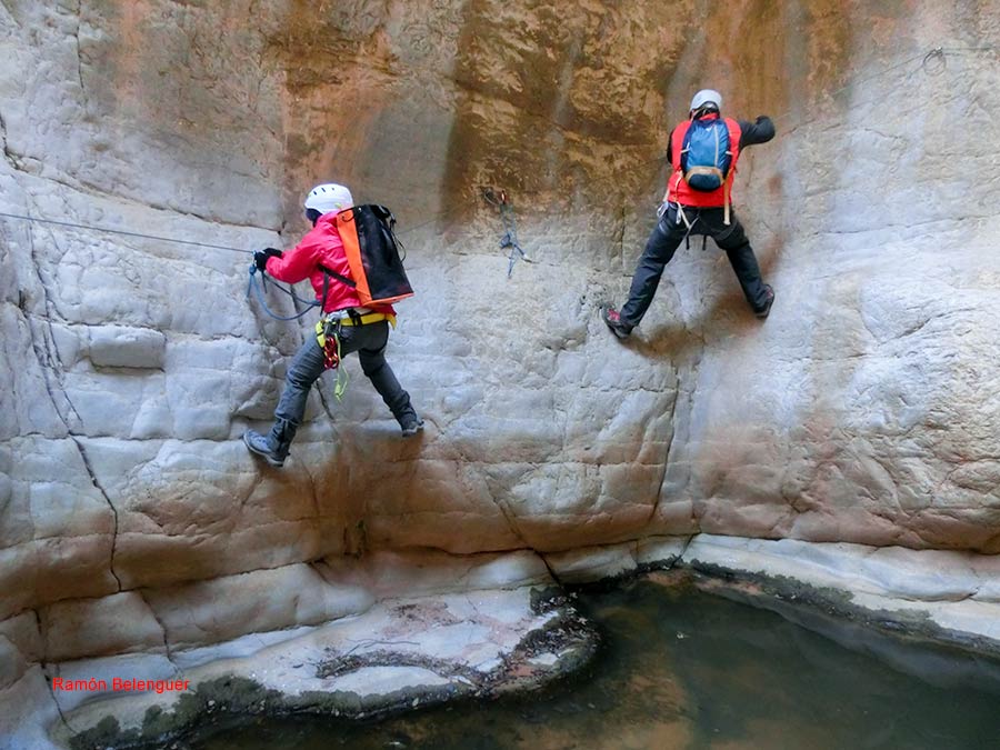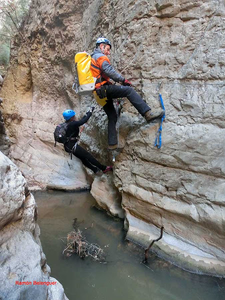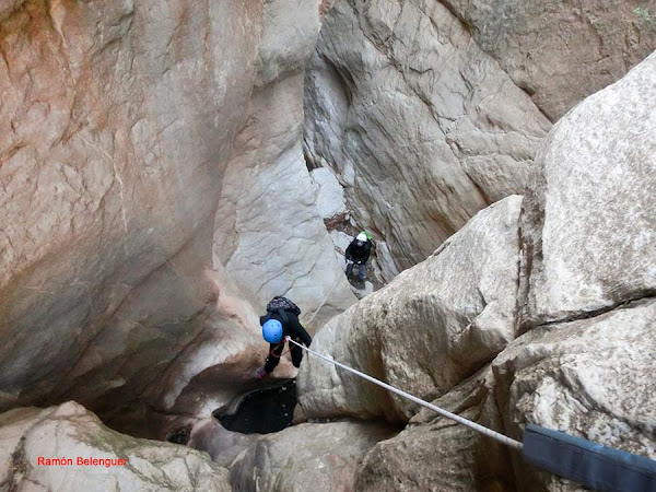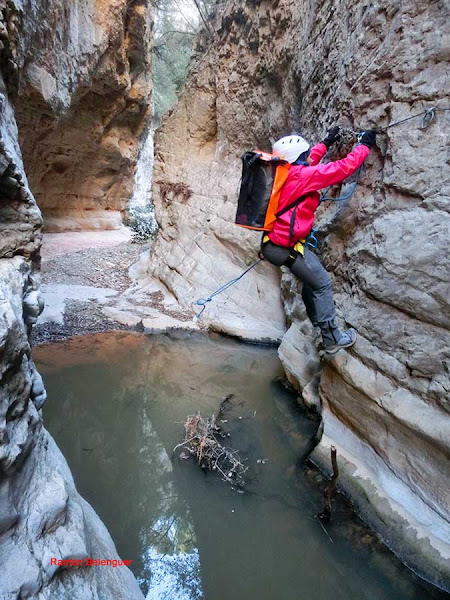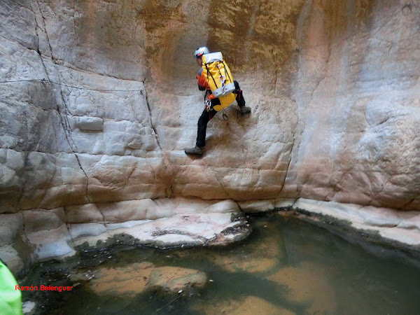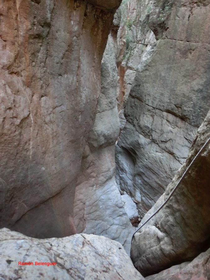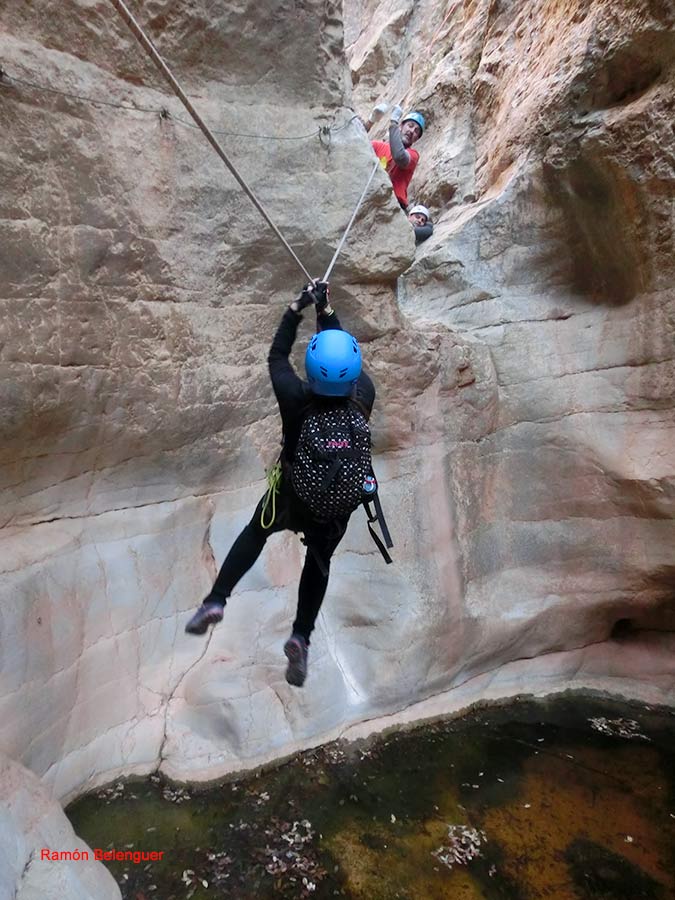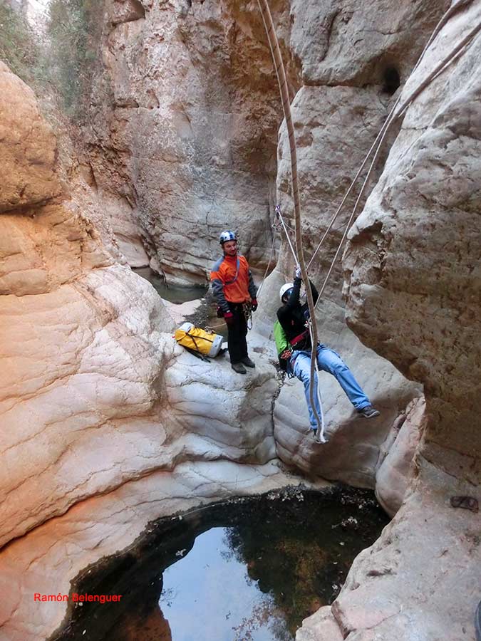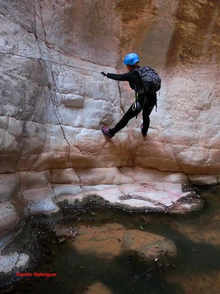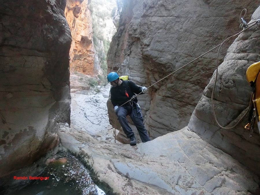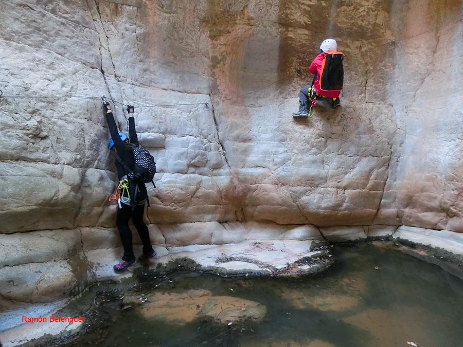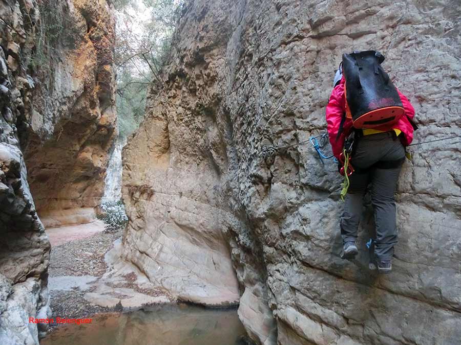 Información de caudal: Seco, el barranco normalmente está seco todo el año, aunque tiene marmitas trampa que pueden albergar agua, pero son evitables mediante pasamanos y péndulo. Hay un pasamanos técnico que puede necesitar del uso de estribos.
