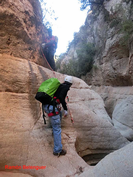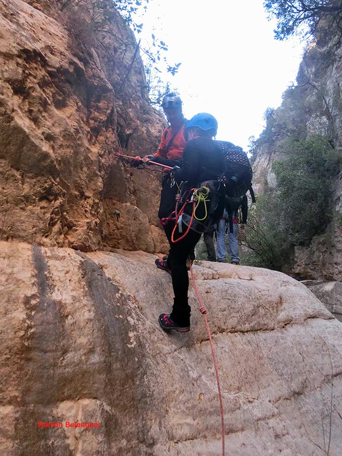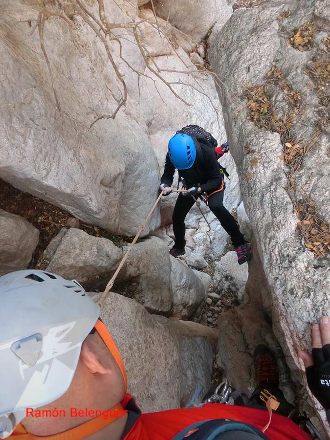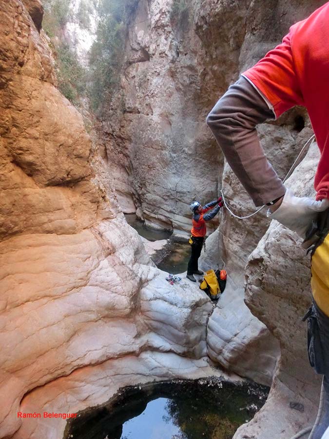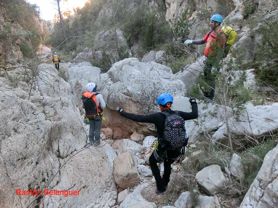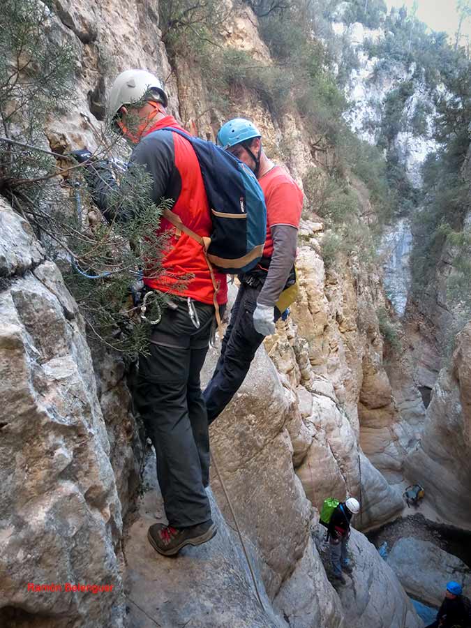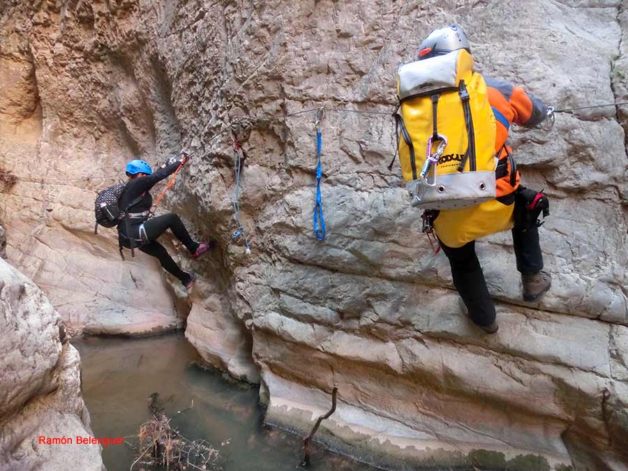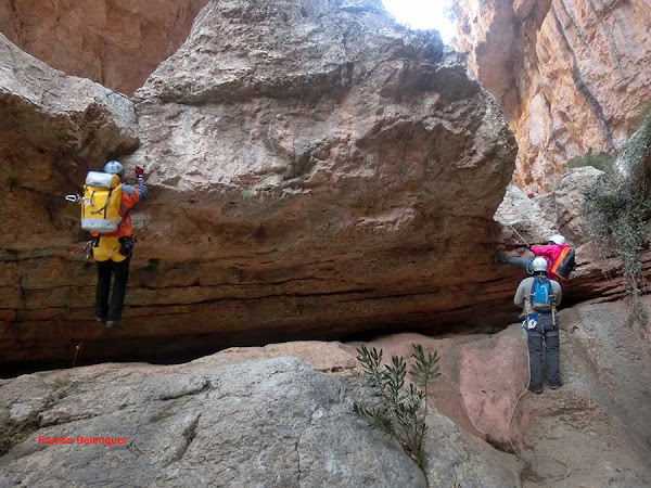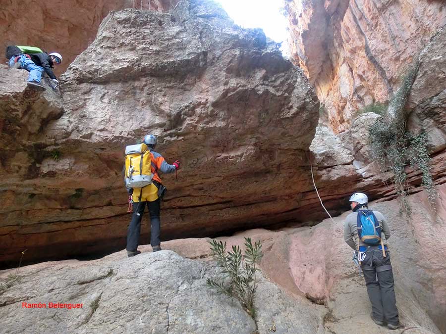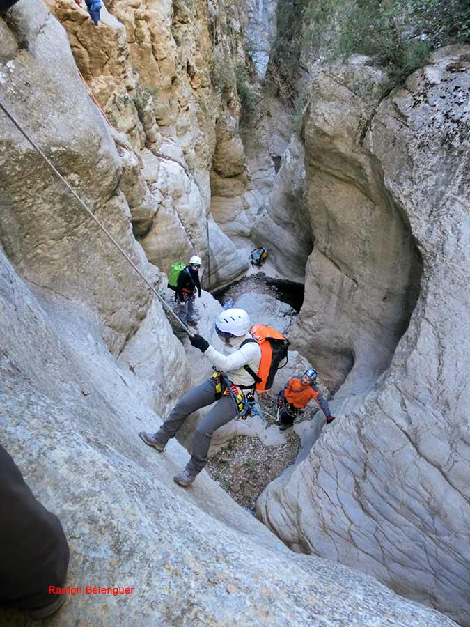 Información de caudal: Seco, el barranco normalmente está seco todo el año, aunque tiene marmitas trampa que pueden albergar agua, pero son evitables mediante pasamanos y péndulo. Hay un pasamanos técnico que puede necesitar del uso de estribos.