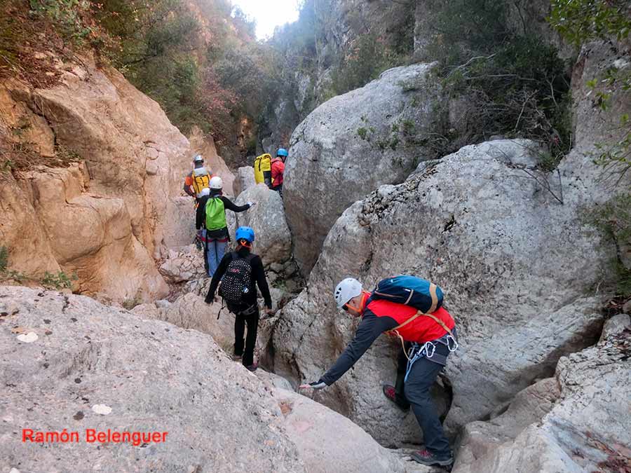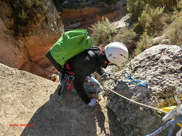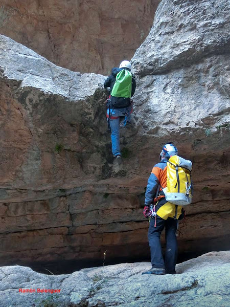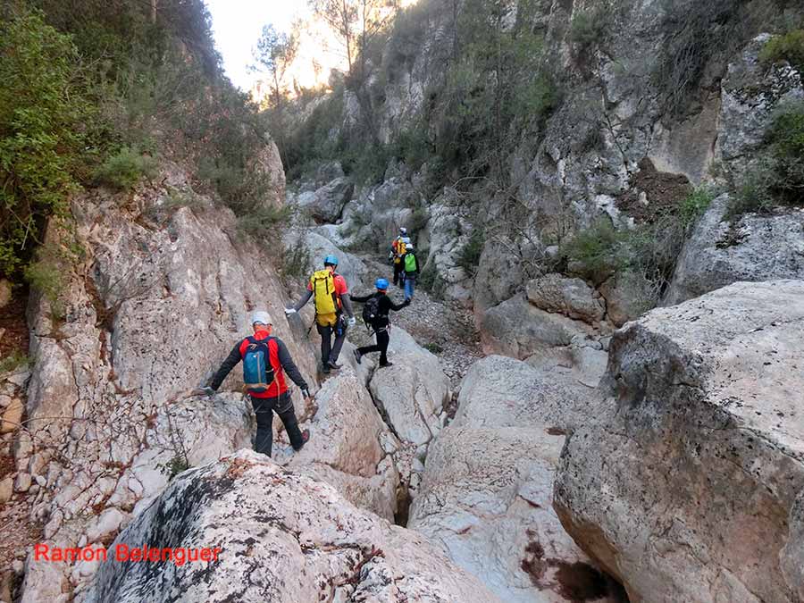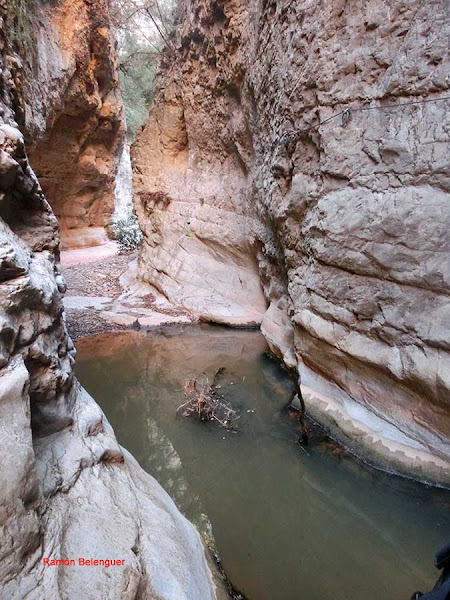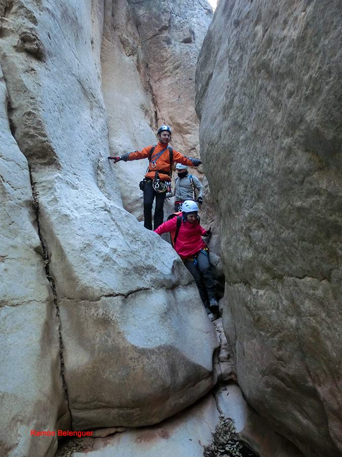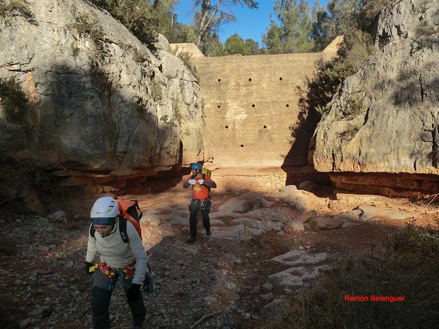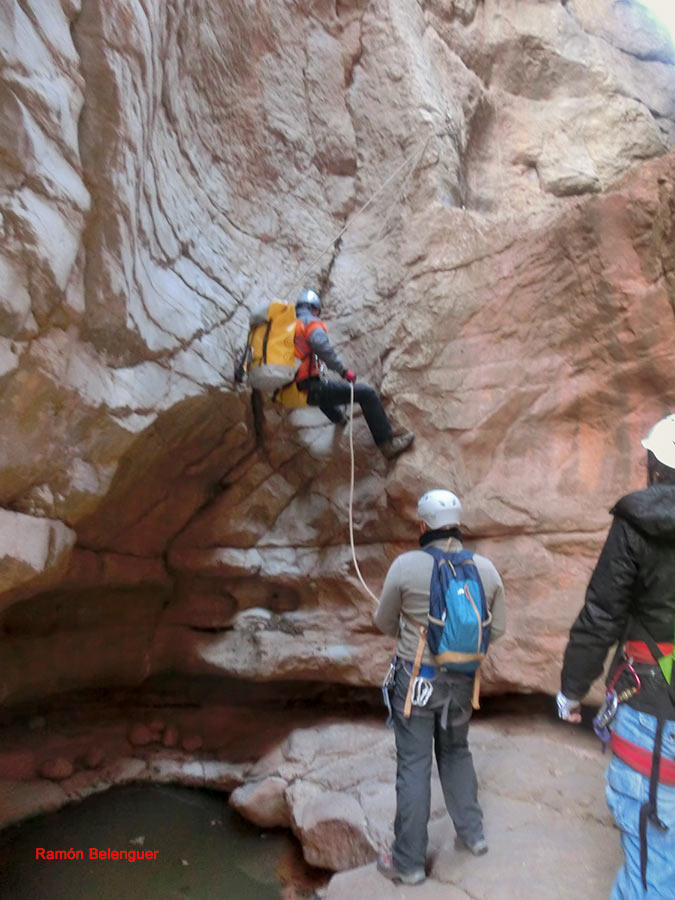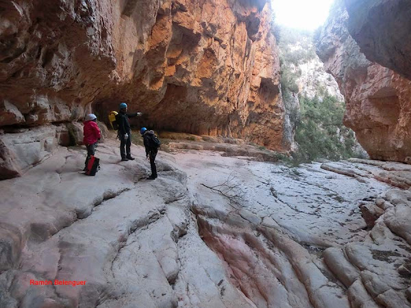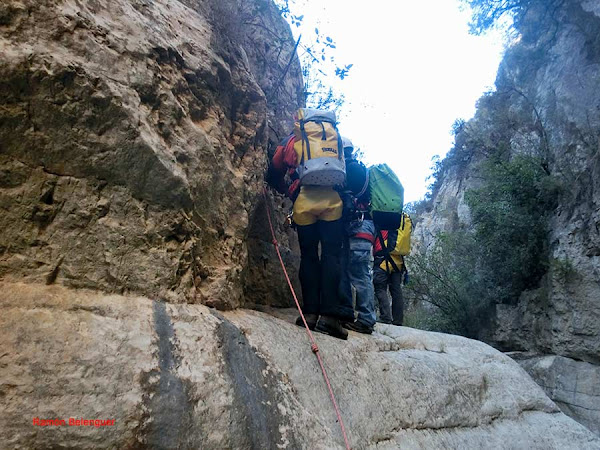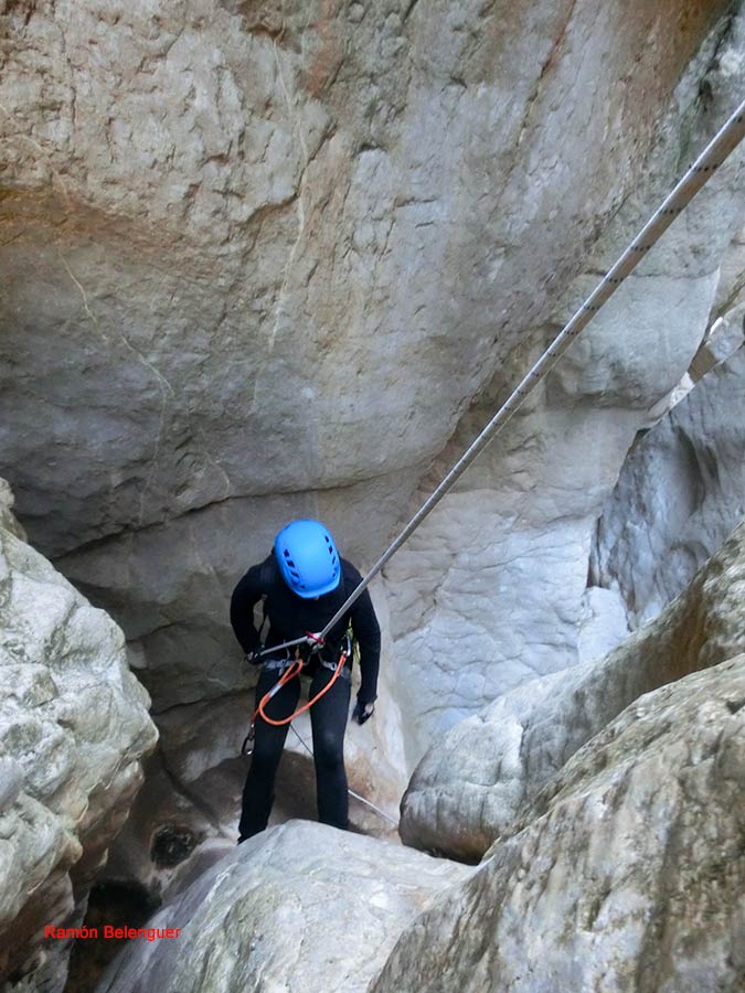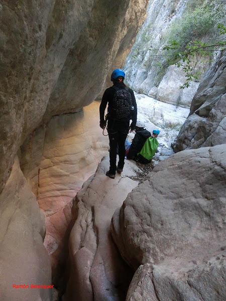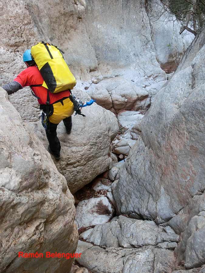 Información de caudal: Seco, el barranco normalmente está seco todo el año, aunque tiene marmitas trampa que pueden albergar agua, pero son evitables mediante pasamanos y péndulo. Hay un pasamanos técnico que puede necesitar del uso de estribos.