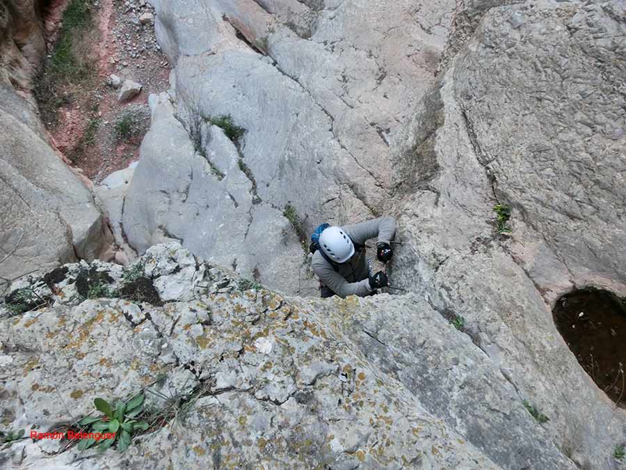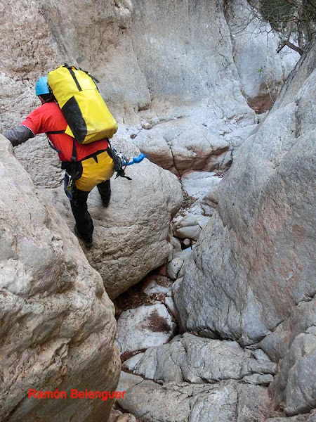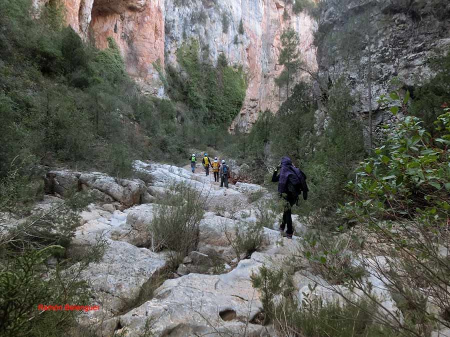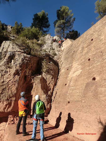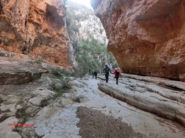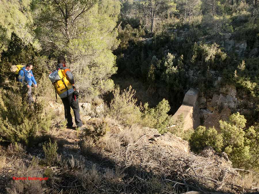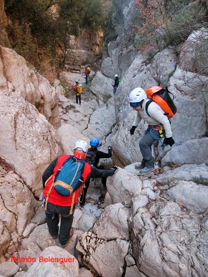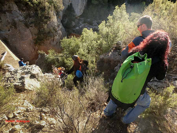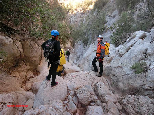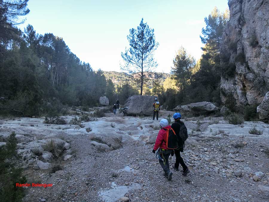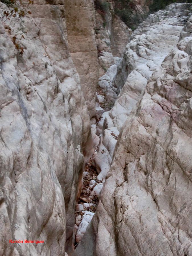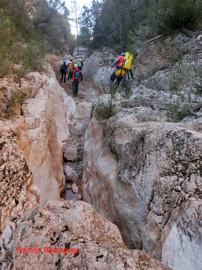 Información de caudal: Seco, el barranco normalmente está seco todo el año, aunque tiene marmitas trampa que pueden albergar agua, pero son evitables mediante pasamanos y péndulo. Hay un pasamanos técnico que puede necesitar del uso de estribos.