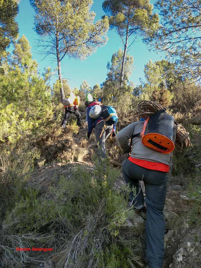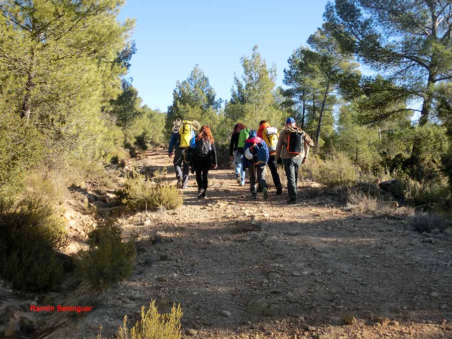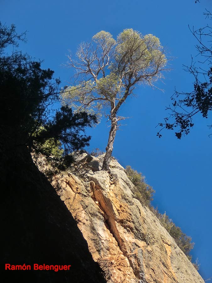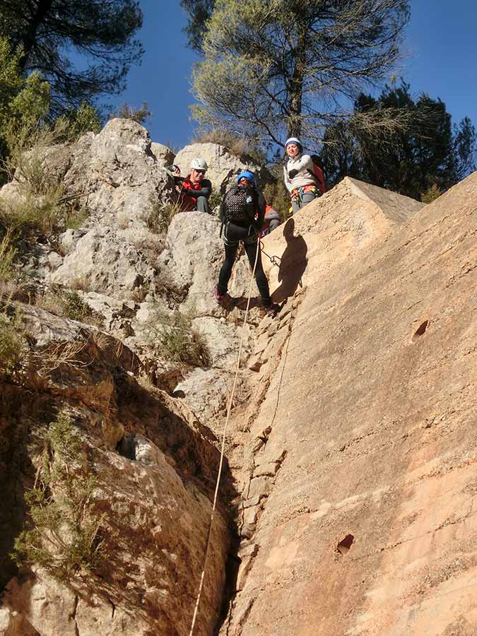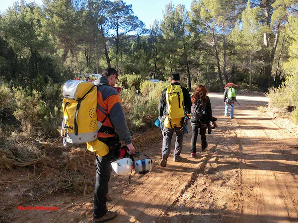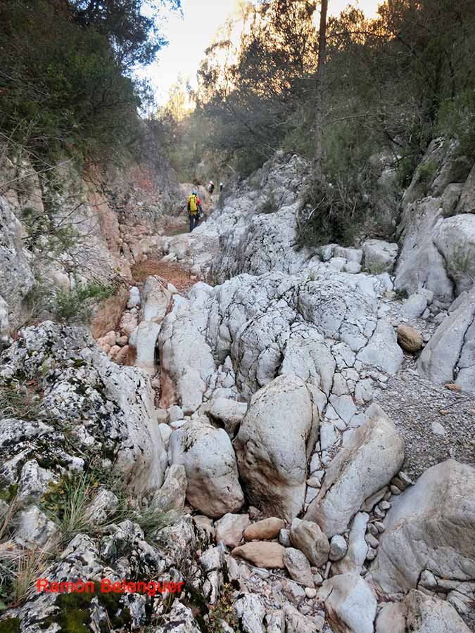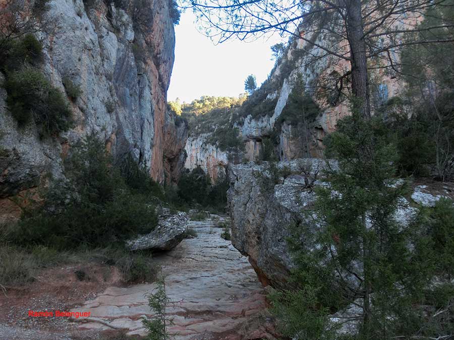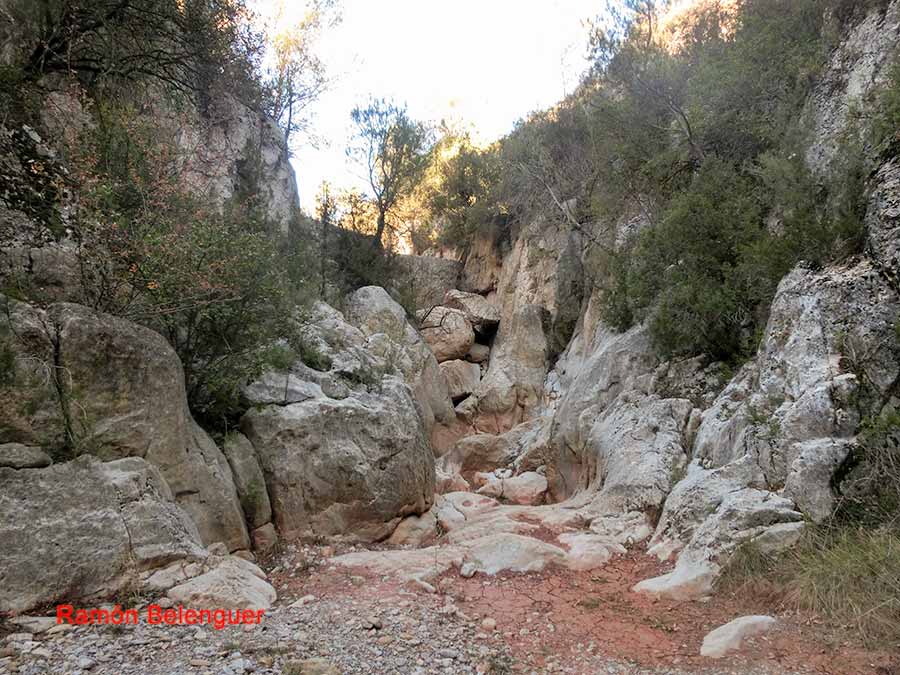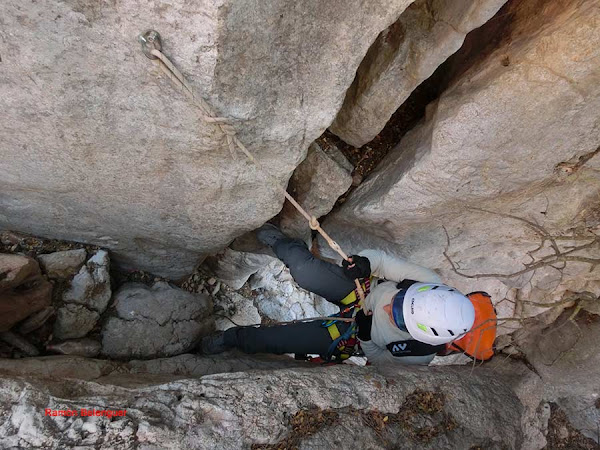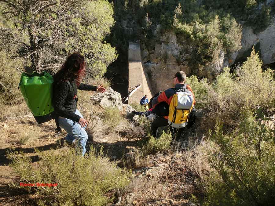 Información de caudal: Seco, el barranco normalmente está seco todo el año, aunque tiene marmitas trampa que pueden albergar agua, pero son evitables mediante pasamanos y péndulo. Hay un pasamanos técnico que puede necesitar del uso de estribos.