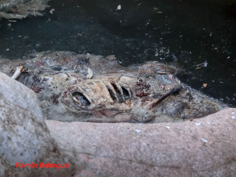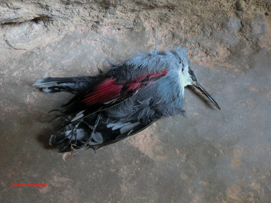 OBSERVACIONES: nos encontramos el cadáver de un treparriscos, arañero o pájaro arañero, Tichodroma muraria, tratándose de una cita importante. Es una pequeña ave que se encuentra a través de las montañas de Eurasia, incluyendo los Pirineos, los Alpes y las montañas del Altái. Es muy dependiente del hábitat altimontano —siempre ocupa paredones entre los 2.200 y los 3.000 metros de altitud—, este insectívoro es un ave escasa y difícil de observar que en invierno amplía sus horizontes para recalar en los cañones calizos de la Meseta o entre los canchales de algunas serranías del sur peninsular.En la península Ibérica su población reproductora se limita a las cumbres de Picos de Europa y del Pirineo.Se trata de un ave de 15,5 a 17 cm de largo con plumaje atractivo en carmesí, gris y negro, con vuelo como de mariposa y guaridas inaccesibles. Su nombre común chino significa flor de roca. El plumaje de este paseriforme es en su mayoría gris y varía ligeramente entre la estación reproductora y el invierno, cuando el ave adquiere una tonalidad más pálida. En esa época, machos y hembras son muy semejantes, pero durante el periodo reproductor el macho lucirá la garganta y el pecho de un intenso color negro, y su plumaje se tornará más oscuro. El rasgo más llamativo de esta pequeña ave, solo se puede descubrir mientras vuela, pues es entonces cuando despliega sus anchas y vistosas alas de color carmín y plumas de vuelo negras con grandes puntos blancos. El joven presenta el plumaje completamente gris, con las alas de un color algo más apagado que en los adultos. Se alimenta de insectos que obtiene con su largo pico, y anida en cavidades rocosas, poniendo 4 a 5 huevos blancos rayados, que son incubados por la hembra. El reclamo lo ejecuta con silbidos agudos y sostenidos, mediante una nota ascendente y otra descendente, tuuuu-ruuiii-ziiuuuu. El canto es semejante al sonido descrito, aunque más variado, con algunos silbidos cortos, tsuíí.