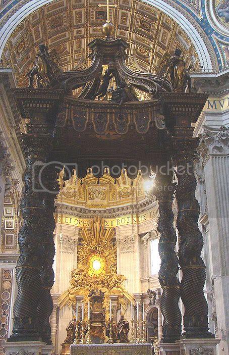 Los nichos de los pilares de la cúpula están ocupados por cuatro estatuas de dimensiones colosales. Más de cinco metros productos del siglo XVII que representan a La Verónica, Elena, madre de Constantino y Longino que traspasó con su lanza el costado de Jesús y Pedro y en su parte superior de encuentran sus reliquias que se exponen al público en los días señalados para ello. En el centro de la Basílica está el Baldaquino creado entre 1624 a 1633 por Bernini, todo en bronce que sirve como altar mayor y que está ubicado sobre la tumba de Pedro. Los zócalos tienen el blasón de la familia del Pontífice Urbano VIII y de allí parten las cuatro descomunales columnas que sostienen el baldaquino con el globo terrestre y la cruz. Obra barroca de Bernini, que para conseguirla, el Papa ordena que se fundiesen los revestimientos de bronce del techo del vestíbulo del Panteón .