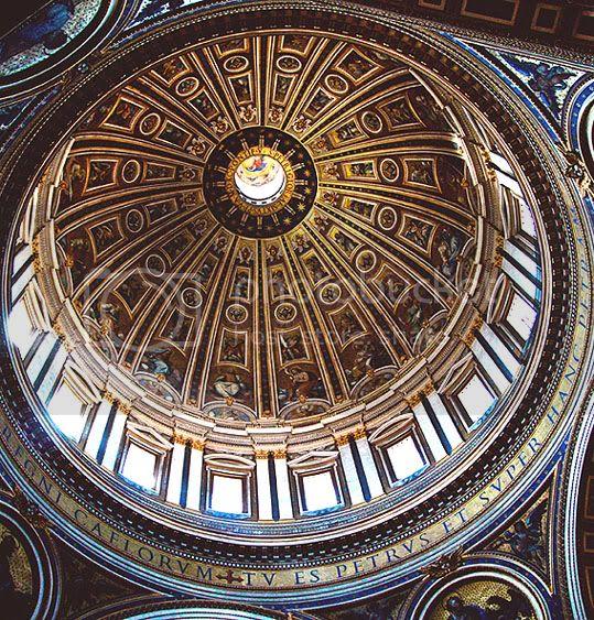 Después de recorrer su hermoso pasillo central que no es otra cosa que la parte más larga de su cruz arquitectónica, llegamos al lugar que nos deja maravillados con su colosal estructura: la cúpula, obra de Miguel Ángel pero que tiene su basamento en las obras de Bernini quien puso las 16 ventanas y el tambor para dar gran luminosidad al templo. El borde inferior de la bóveda proclama la frase “Tu eres Pedro y sobre esta piedra edificaré mi iglesia y te daré las llave de los cielos”. Muchos mosaicos, obras de Cavalir d´Arpino de 1568 y la totalidad de la cúpula que representa el reino celestial.