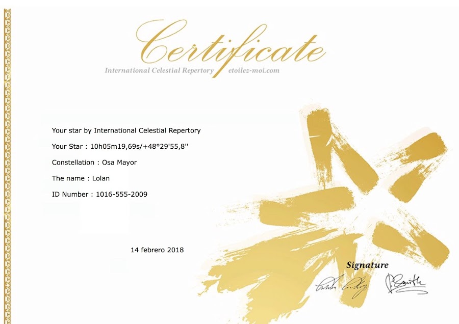 La estrella de nuestros niños está dentro de la constelación de la OSA MAYOR, y las coordenadas concretas nos las envían en el certificado del International Celestial Repertory, un Registro Oficial de identificación de estrellas creado en 1980 en los EEUU.