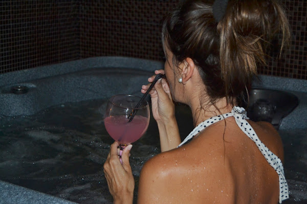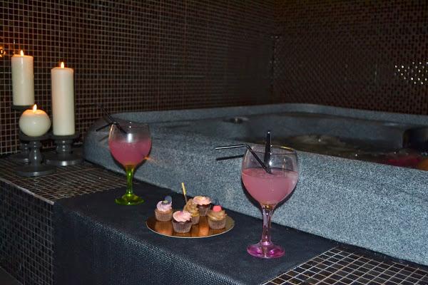 Comenzamos relajándonos en el jacuzzi, con una tenue luz, envueltos en una atmósfera de velas, brindando con un Gin-Tonic de fresa en la mano y disfrutando de un delicioso surtido de dulces y cupcakes para dos.