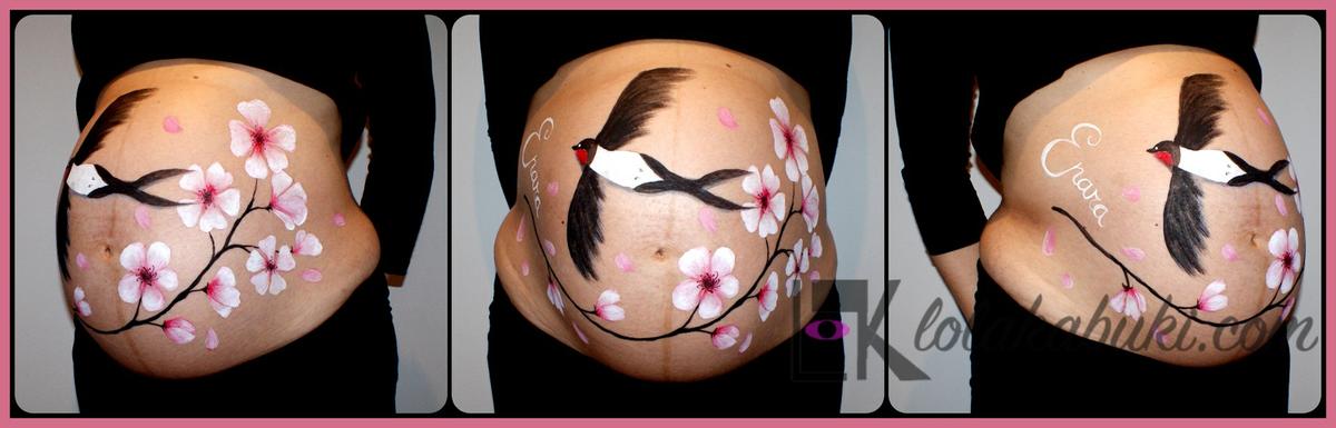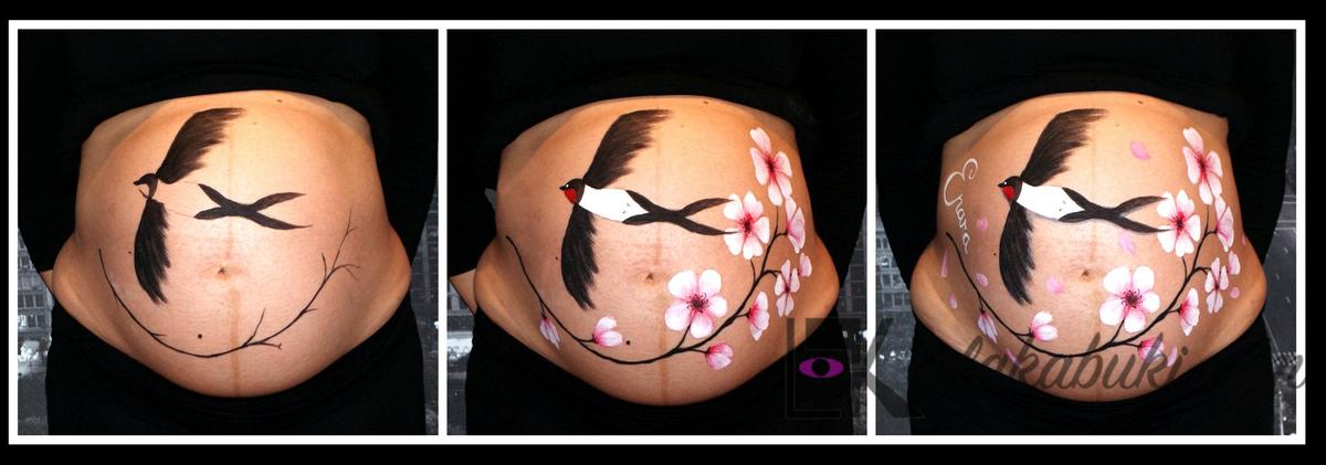 Belly Paint Golondrina volando entre flores de almendro. Una pintura clásica y de estilo oriental.