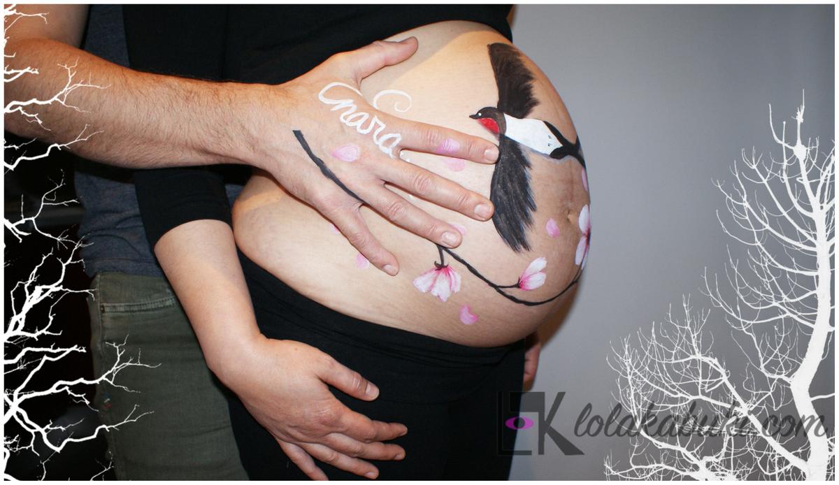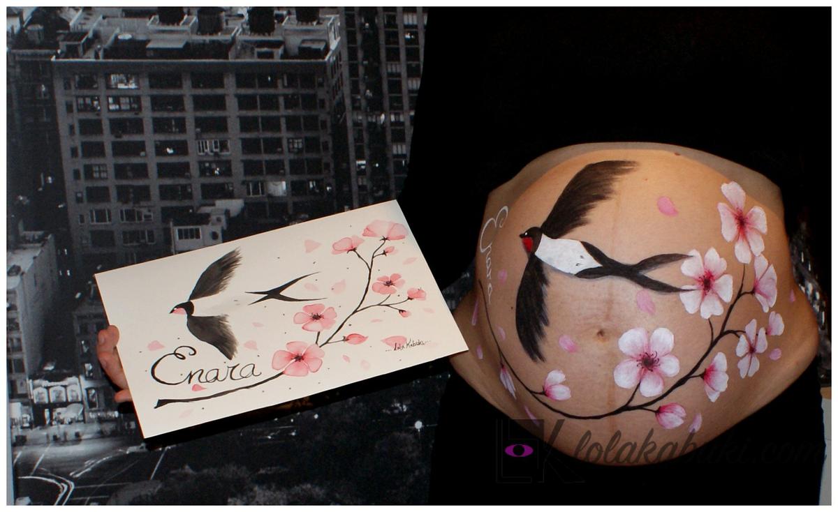 Belly Paint Golondrina volando entre flores es una pintura artística clásica, realizada sobre piel en los últimos meses de embarazo. Una pintura realizada con una paleta de colores muy clarita, y con el color negro de la golondrina a contraste.