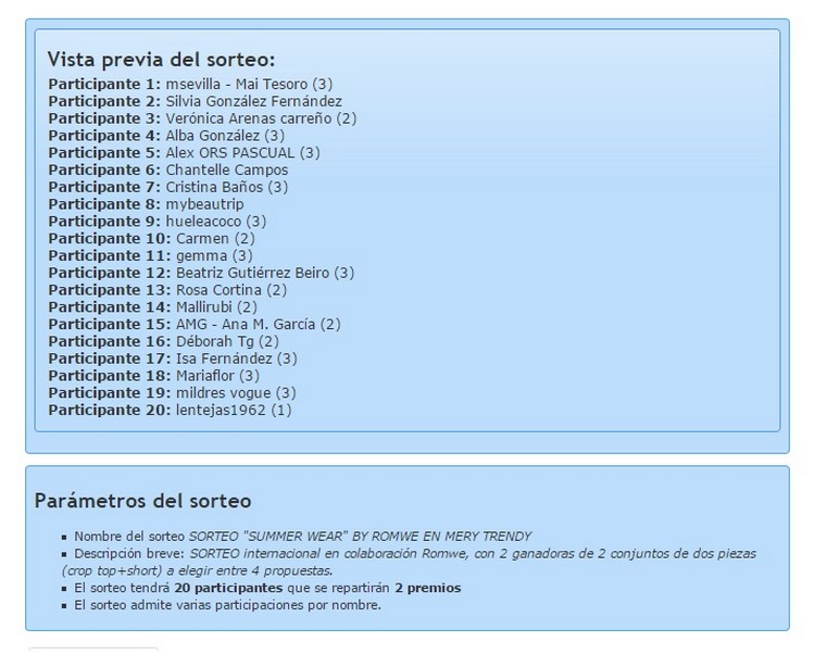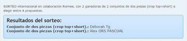 Por otra parte, os dejo el listado de participantes del SORTEO "SUMMER WEAR" by Romwe que habéis optado al premio de 2 conjuntos de dos piezas (crop top + short) a elegir, cortesía de Romwe, en el sorteo realizado a través de Sortea2 y cuyas bases publicaba aquí el 12 de junio