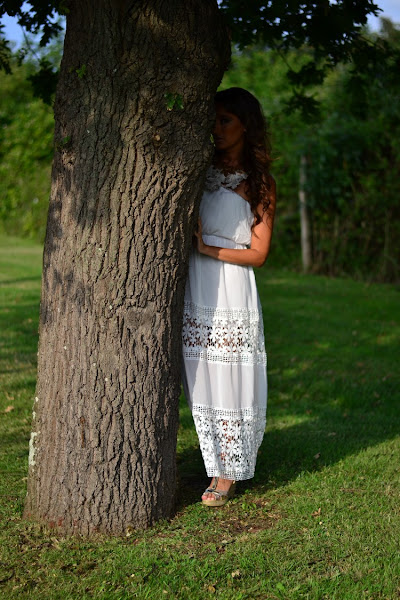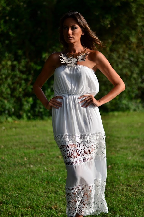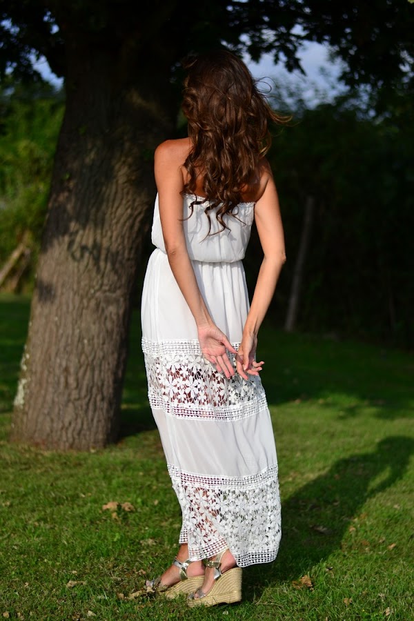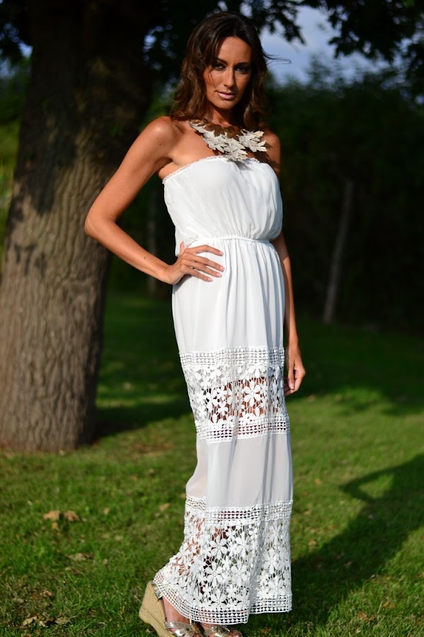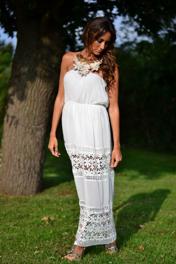 Hoy os presento un look muy romántico e inspirado en la naturaleza, con vestido largo palabra de honor de Romwe en color blanco (para potenciar el bronceado) y con encaje como pieza central con el que os doy oficialmente la bienvenida al mes de julio y al buen tiempo.