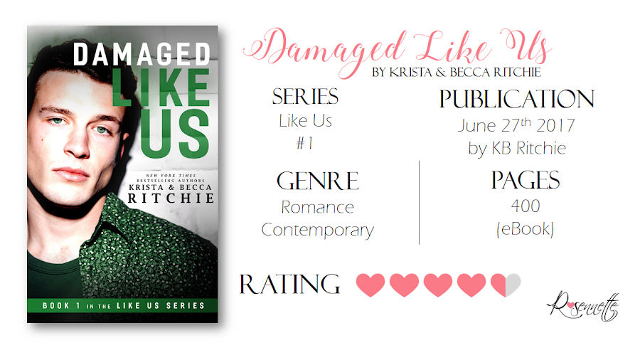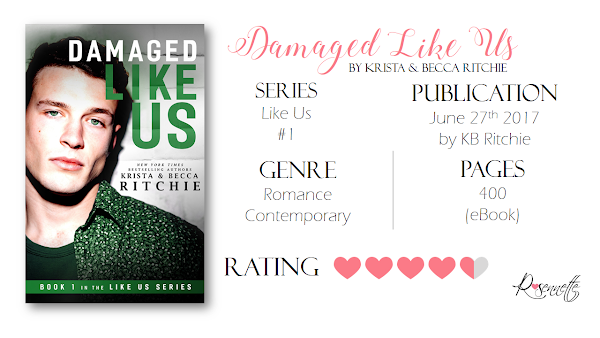 Ahora, Damaged Like Us, como digo arriba, se trata de Maximoff (Moffy) Hale, el hijo mayor los famosos Lily y Loren Hale, por ello, él es el más responsable de todo sus primos, siempre siguiendo las reglas y lo más importante, aceptando su vida no convencional rodeado de paparazzi y fans, donde la privacidad es un privilegio y la prensa difunde rumores sobre él y su familia todo el tiempo. Debido a su estatus de celebridad necesita un guardaespaldas capaz y comprometido 24/7 que puede mantenerse al día con su estilo de vida caótico. Entra Farrow Keen, un graduado de Yale de veintisiete años con cabello blanco, piercings y tatuajes que no sólo está asignado a cuidar de Maximoff, sino también es quien plaga sus fantasías más sensuales. Farrow es realmente bueno en su trabajo, le encanta y sabe que dormir con el cliente es un gran no-no, pero la atracción es demasiado fuerte para ser negado y cuando los sentimientos empiezan a mostrarse ambos tienen que hacer algunos sacrificios para salvar su amor.