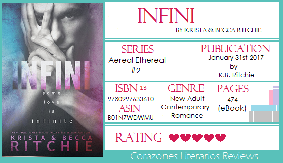 I believe so far February becomes my favorite book month this year; theres no better way to start 2017 than reading from my favorite authors. Around September last year I was into a very serious reading slump after finishing Some Kind of Perfect by Krista and Becca Ritchie, I was only able to pick few books that I REALLY wanted to read but otherwise, I couldnt even look anything else, and I beautifully fail my reading challenge. Now, I take the risk and pick up the new Aereal Ethereal book by K&B, INFINI, and let me tell you guys, it didnt disappoint.