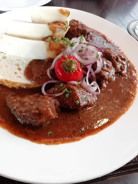 Estofado de la Casa picante con cebolla pan al vapor.