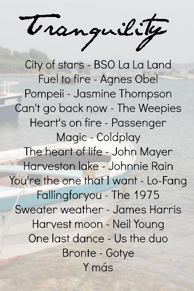 Tengo muchísimas canciones para relajarme, la verdad, pero las tengo distribuidas en playlists que no son específicamente para eso (imaginaos, tengo una que se llama Tarde en casa y hay de todo) y luego me vuelvo loca para encontrar la música ideal para pasar una mañana de domingo, por ejemplo. De ahí nació la necesidad de esta nueva playlist: tranquilidad. Esas canciones que te transmiten paz interior y sirven de fondo para hacer cosas como coser, pintar o leer una revista.