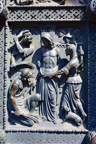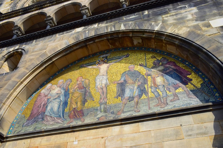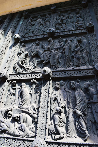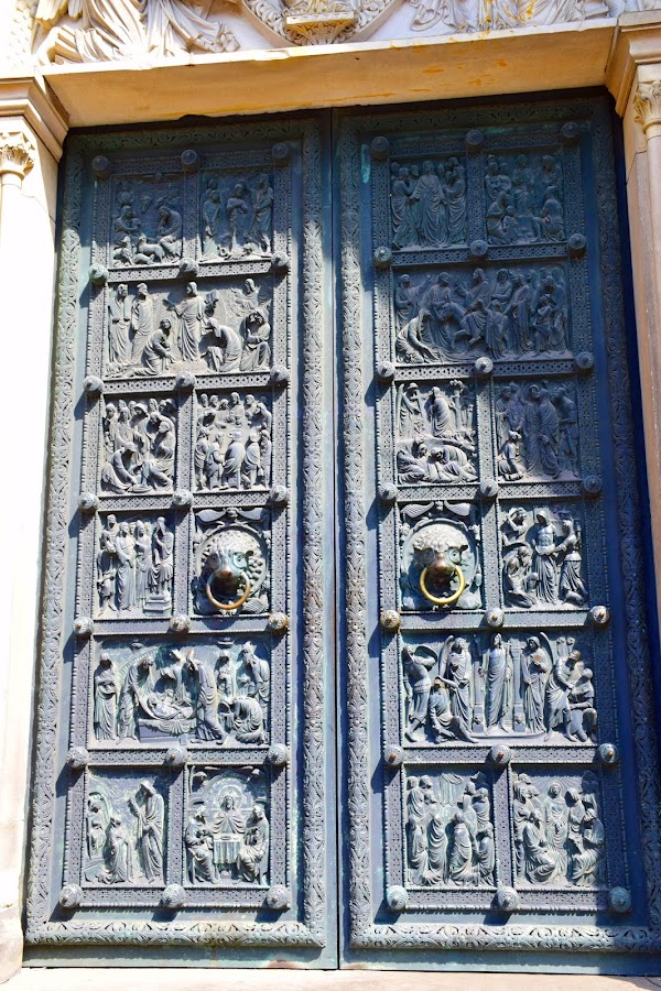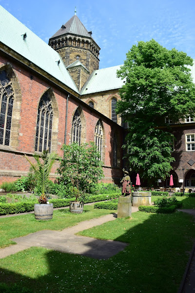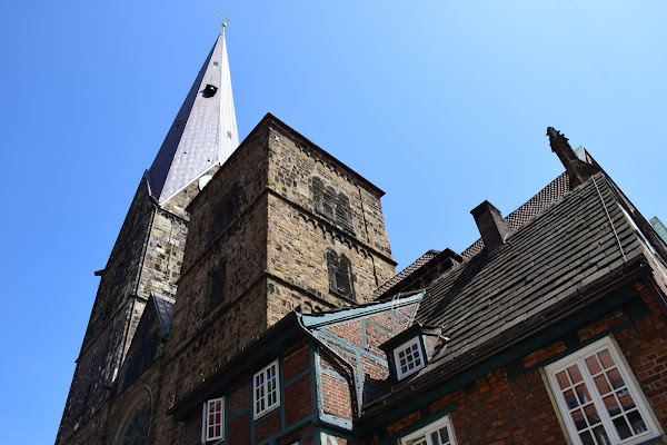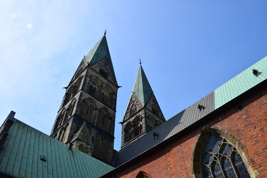 Escoltada por el patrón de la catedral, San Pedro, con sus llaves para abrir el cielo, y Carlomagno, fundador de la ciudad de Bremen con una miniatura de la catedral en sus manos, la imponente basílica se empezó a construir en estilo románico y sólo se completó bien entrado el siglo XX, por lo que a simple vista pueden verse los diferentes estilos arquitectónicos que fueron dando forma al enorme templo.