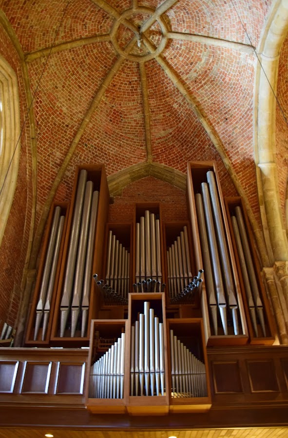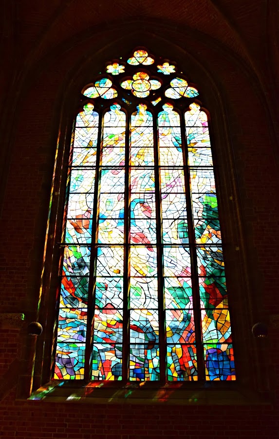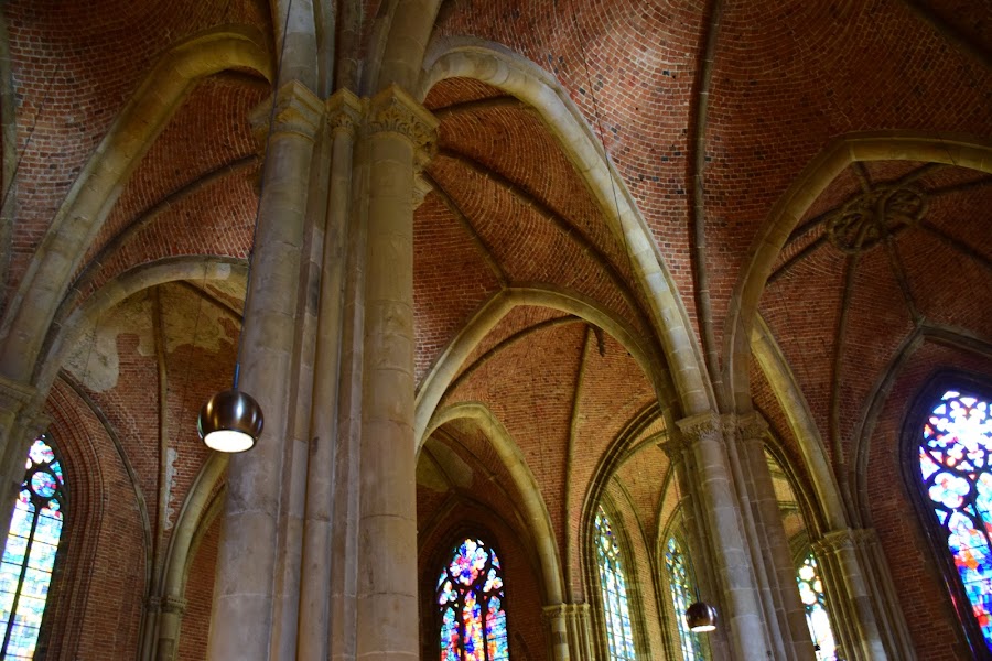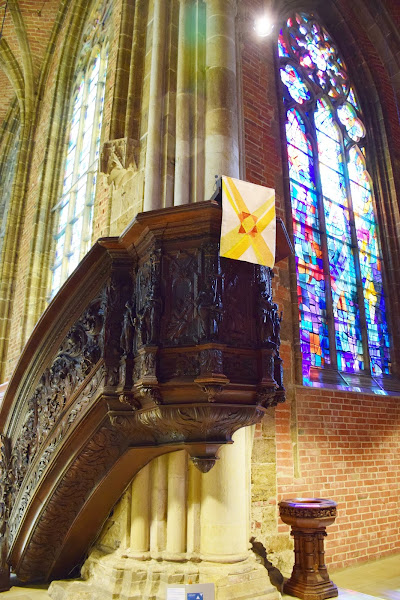 Ya dentro y tras pasar los muros de ladrillo rojo encontramos algunos tesoros, como el púlpito tallado del siglo XVIII o las maravillosas vidrieras de Alfred Manessier.