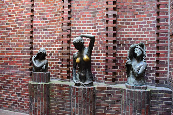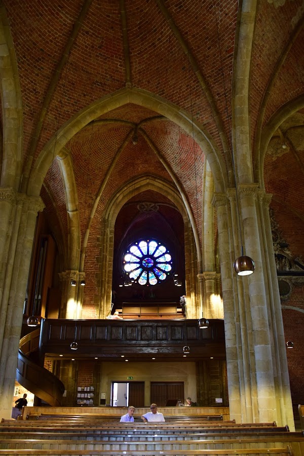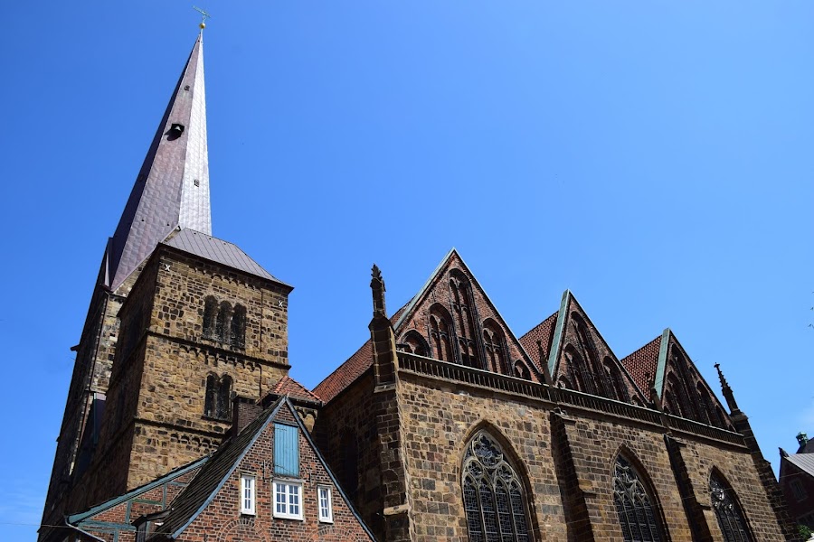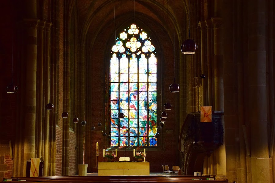 Alta, como todas las iglesias del norte germano, la nave se eleva casi tocando las nubes, y una torre románica da escolta a su hermana mayor, que fue gravemente dañada durante los bombardeos aliados de la Segunda Guerra Mundial.