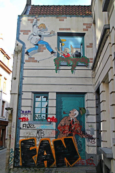 Ya es media tarde y recorremos Bruselas disfrutando del maravilloso día que hace y de otro de sus atractivos: el cómic y las pinturas murales que hay en la calle. No en vano Bruselas es la cuna del comic. Quién no conoce a Tintín, a Lucky Luke, a los Pitufos…
