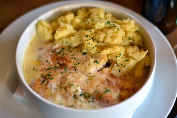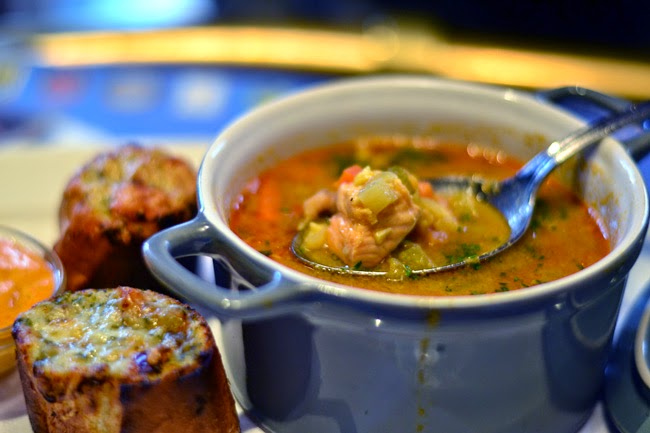 Aún así, creo que en esa comida acerté yo con un estofado de salmón, lenguado y gambas grises, unos camarones muy típicos de allí, con un punto de hinojo fresco que le iba genial. La cerveza que redondeaba la salsa, un pelín picantona y deliciosa, era la local "Brugse Zot", de la que hablaré en otra entrada dedicada a las cervezas. Acompañaban al guiso dos rebanadas de pan con ajo gratinadas y una salsa holandesa picante, una auténtica pasada.