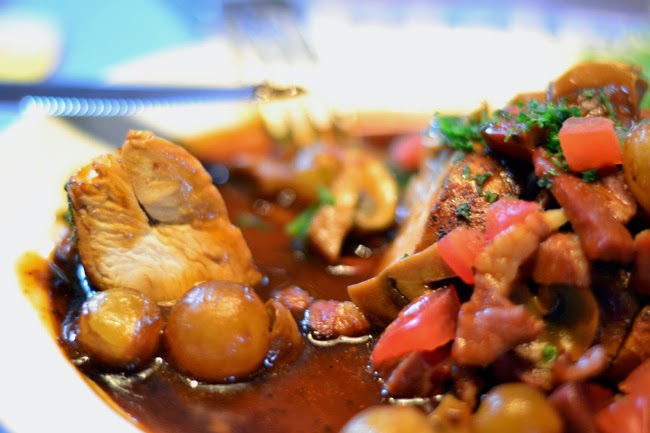 La pechuga de pollo con cebollitas, champiñones y bacon, regada con una "Flemish Old Brown" resultó muy sabrosa, si bien le sobraban cinco minutos de cocción. Con todo, un acierto.