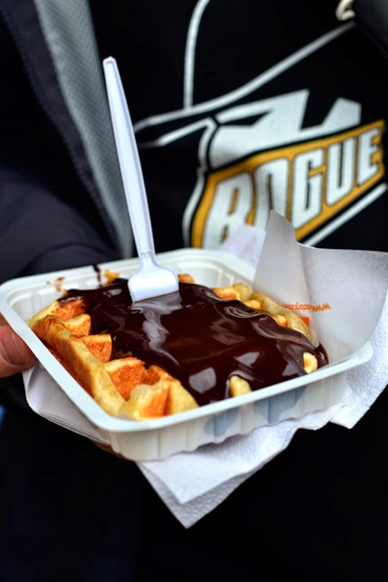 Nos lo sirvieron recién hecho, otro aliciente, pues en muchos sitios tienen una tanda de gofres ya cocidos que te recalientan en la plancha. El chocolate fue su punto débil, pues era chocolate con leche. No es que fuera malo, estaba muy bien, pero desmerecía el conjunto.