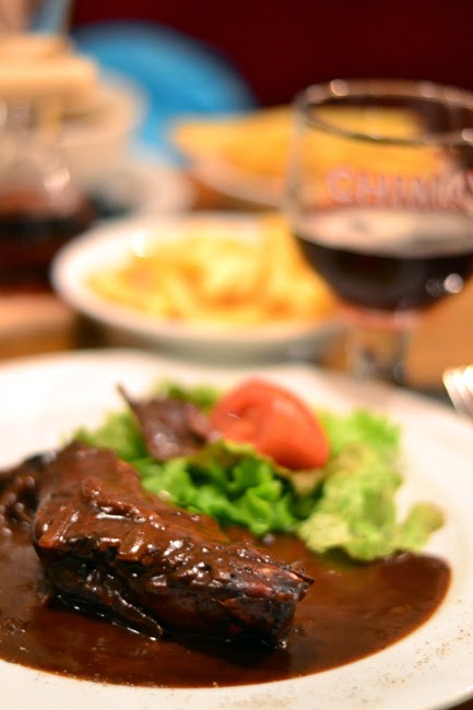 En Brujas el guía nos recomendó el Cambrinus, una cervecería muy mona lo suficientemente alejada de la plaza principal de Brujas para que no fuera insultantemente cara. El servicio es bastante rápido, pese a que nos tocó un muchacho que estaba a por uvas, y la comida es excelente, con platos a base de cerveza.