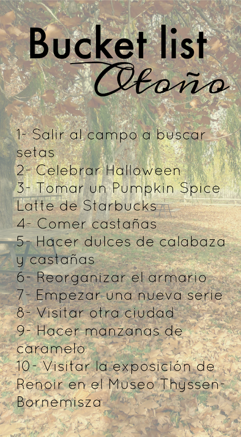 Se me ha ocurrido que sería una idea genial hacer una de estas listas al principio de cada estación. Así podría compartir con vosotros todos mis planes, vosotros podríais coger ideas (o apuntaros al plan) y yo me aseguraría de cumplir más puntos de la lista.