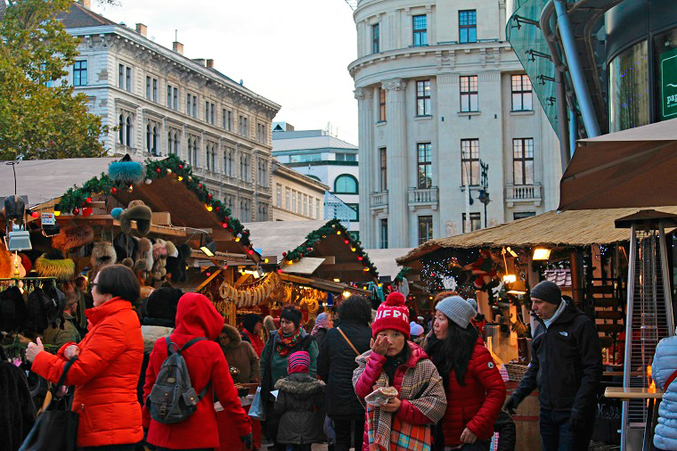 Nuestro paseo terminó en la navideña y animada plaza Vörösmarty tér porque ya iba siendo hora de comer y allí nos esperaba un monísimo mercadillo navideño con muchos puestos de comida tradicional húngara que nos cautivaba con su olor a salchichas especiadas a la brasa y vino caliente. El aspecto de la comida era buenísimo y había tan buen ambiente y tanta gente que decidimos hacer la comida en el mercadillo.