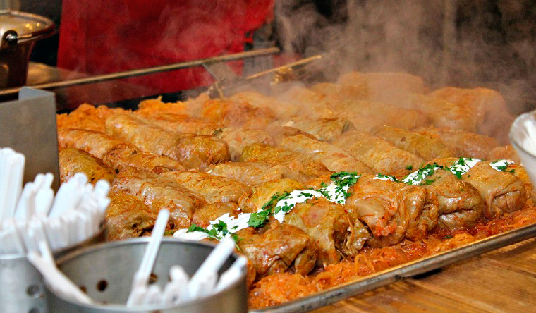 Saco de nuevo a la luz el post de la comida típica húngara que nos sirvió de guía para escoger nuestro plato. Lo primero de todo una brocheta gigante que pintaba buenísima y no falló a nuestro juicio, después nos pedimos tölttöt káposzta para los dos (bolas de repollo con arroz y carne picada especiada) y con salsa agria ¿por qué no? húngaros a muerte! este plato no fallaba en ningún puesto y dijimos habrá que probarlo.
