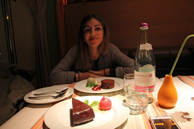 Al llegar al restaurante Menza nos quedamos con la boca abierta de lo chulo y chik que era, con su hilo musical, su luz ambiente, su gente guay... y nosotros con nuestras pintas de turistas cargados de mochila y cámara, además el servicio fue excepcional. El momento estrella del restaurante fue al probar nuestro deseado goulash que se nos había resistido mucho ¡¡estuvimos a punto de volver a Madrid sin haberlo probado después de 4 días!! y bueno, yo pedí una sopa de la casa un poco a ciegas imaginando que sería estilo goulash pero no, y después un postre. Todo estaba delicioso así que nos fuimos de allí con muy buen sabor de boca. Y para nuestra sorpresa: la cuenta en total vinieron a ser unos 13 por persona al cambio.