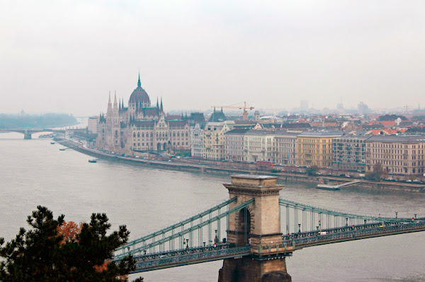 Todas las calles estaban mojadas pero la nieve no llegó a cuajar y tampoco había nadie por las calles así que la ciudad estaba muy tranquila. El plan de hoy era volver a la colina de Buda para ver las vistas con "sol" desde el castillo, pero no dejó de chispear casi todo el recorrido desde el apartamento al Puente de las Cadenas. Desde arriba las vistas no eran las que hubiésemos deseado, pero estamos en Budapest; es como ir a Londres y pretender que en todas las fotos esté el cielo azul. Era un encanto diferente que no dejaba de gustarnos mucho.