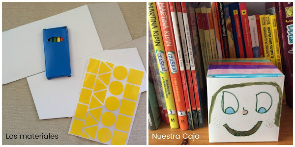 Con el libro recibimos materiales para crear nuestro propio personaje Caja tras la lectura. Nos enviaron una caja de cartón con un montaje muy sencillo, unas pegatinas con formas geométricas y una caja de pinturas de madera.