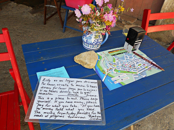 Cuando he llegado a Vilachá me sentía con ganas de continuar y al final he llegado a Portomarín, pero antes no he podido por menos que contemplar "Casa Susana", mira que hospitalidad. Tiene todas estas cositas en el porche de la casa para los peregrinos que lo necesiten, también puedes sellar tu credencial.