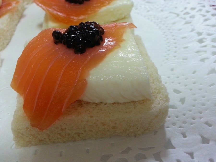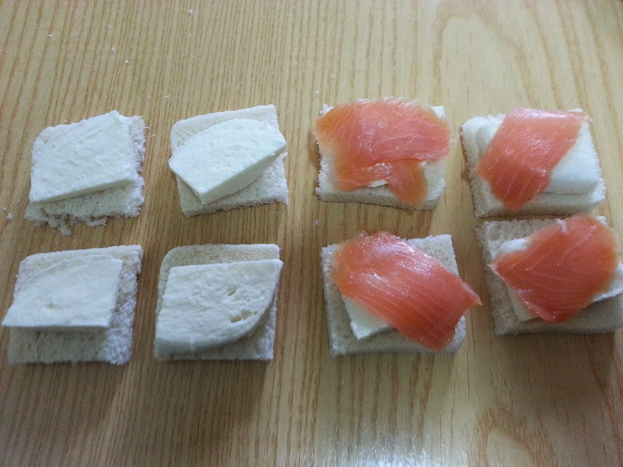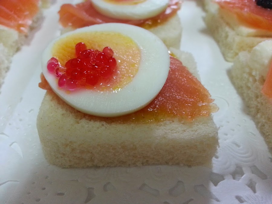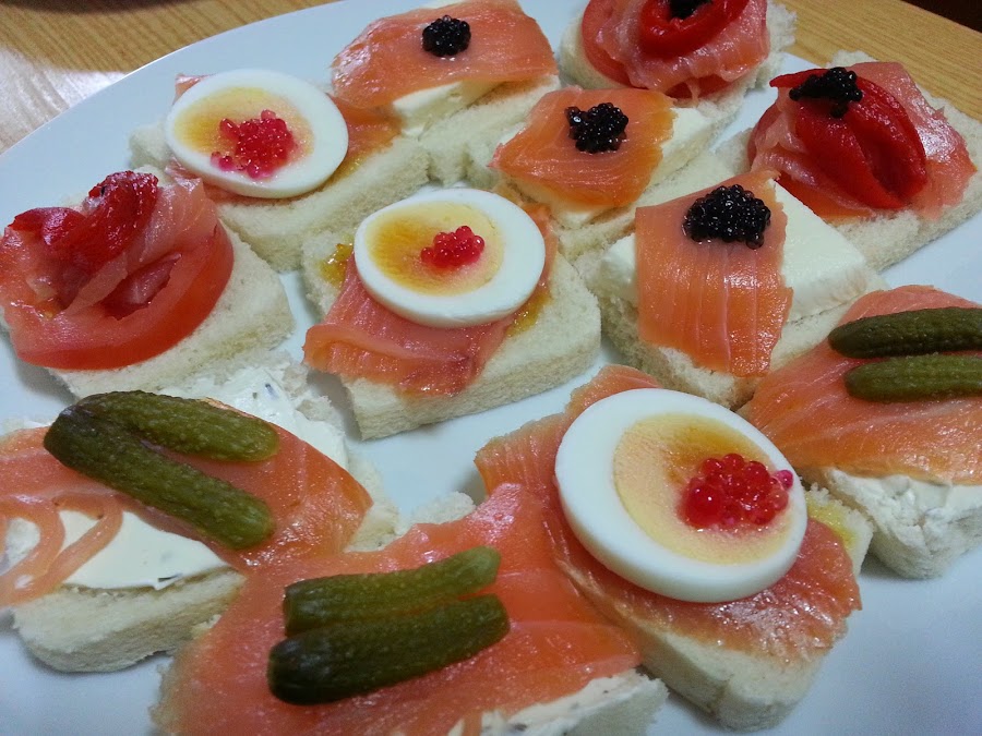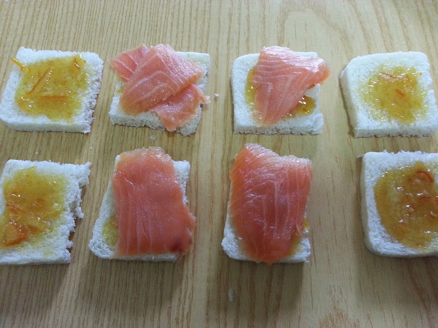 La segunda lleva mermelada de naranja untada sobre el pan, salmón, huevo cocido y sucedáneo de caviar.