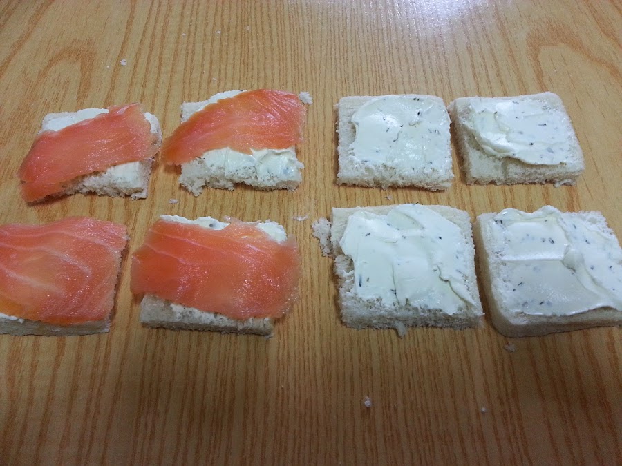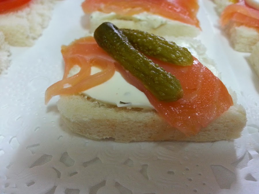 La siguiente lleva una base generosa de queso de untar a las finas hierbas, salmón y pepinillo.