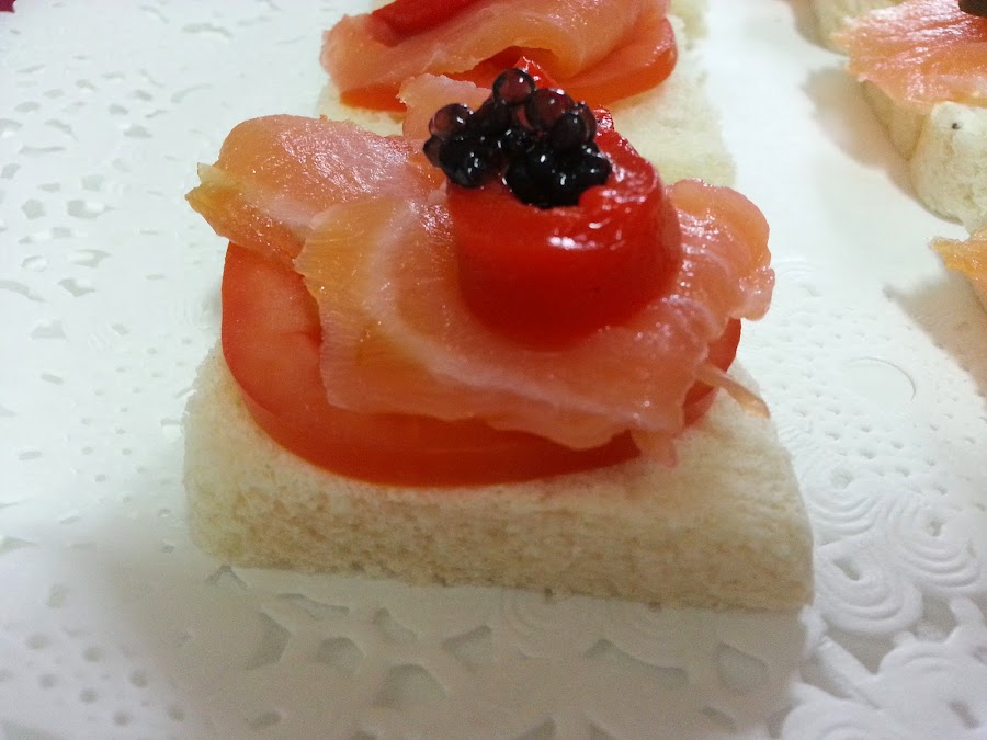 Terminamos con una de rodaja de tomate, salmón, pimiento del piquillo y sucedáneo de caviar.