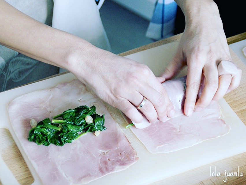 Ahora vamos a montar los canelones. Cogemos una loncha de jamón de york, la colocamos sobre la tabla, le añadimos un poco de salteado de espinacas y enrollamos.