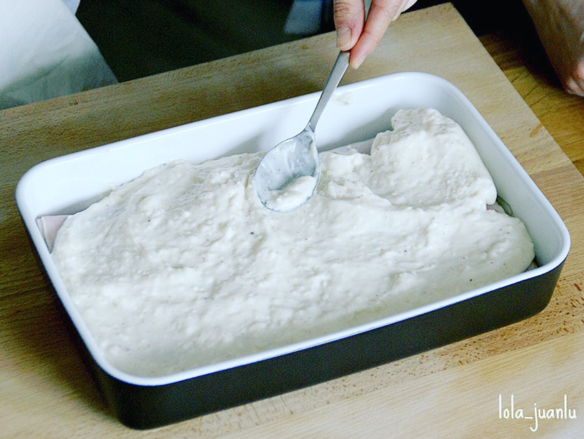 Una vez tenemos todos los canelones hechos, cubrimos con la bechamel.