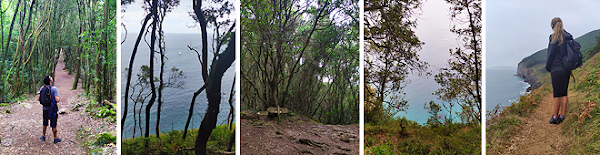 Esto lo digo desde un punto de vista objetivo porque nuestra experiencia no fue precisamente buena. Es cierto que el paisaje, el bosque y las vistas hacia la ría de Santoña, una vez has ascendido por el sendero son preciosas, pero veníamos de estar en el paraíso y de ver algunos de los pueblos más bonitos de España. Además estaba lloviendo y el cielo estaba muy gris. Perdimos mucho tiempo buscando aparcamiento y ya llegábamos tarde. A ratos empezaba a llover y hacía frío, pero en la que paraba, al ir cuesta arriba volvía a hacer calor así que nos pusimos y quitamos los chubasqueros 30 veces (me quejo mucho, lo sé. Que se lo digan a Carlos).