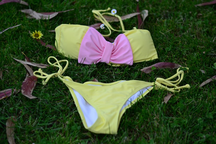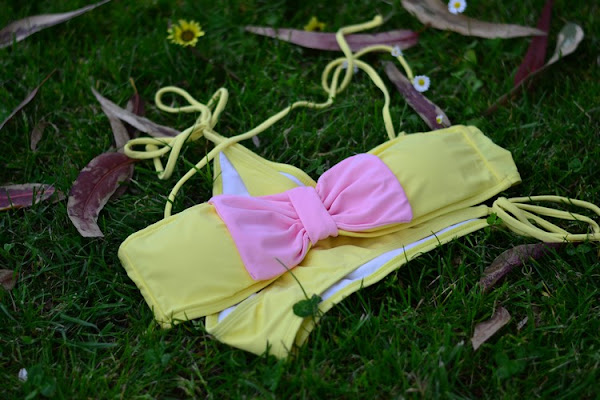 Me gusta mucho, además de por el color amarillo, tan favorecedor estando algo morenita, por el detalle del lazo en el centro del pecho y porque los tirantes son extraíbles (y a la hora de bañarse, siempre resulta más cómodo ponérselos si cabe la posibilidad de que sean de quita y pon, como es el caso). Asimismo me gusta que la braguita también se pueda anudar en los laterales.