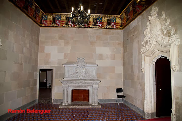 Es una gran sala rectangular, X-NONE X-NONE la decoración que presenta es debida a la reforma de 1900 cuando el marqués de Monistrol de Noya decidió utilizar el castillo como residencia de veranocon un magnifico artesonado de madera, rematado por un friso con los escudos de armas de los Cavanilles-Villarrasa y una curiosa frase fragmentada que reza lo siguiente: "La superbia de vos matará amos e dos" (Vuestra soberbia os va a matar)