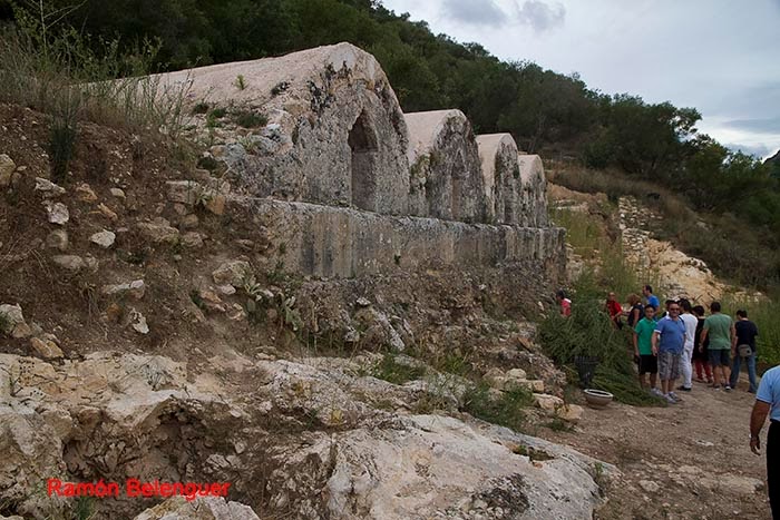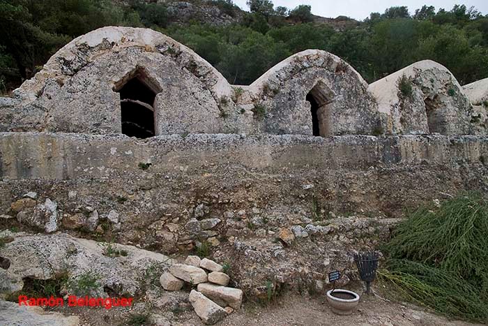 Allí se encuentran los cuatro aljibes aunque inicialmente se creian de época romána, datan de los siglos X-XI pero con bóvedas góticas. Se encuentran situados extramuros. El agua llegaba desde las acequias y através de la balsa de decantación entraba en el aljibe. Poseen 4 ventanas góticas y varias escotillas superiores que le proporcionaban la ventilación necesaria. Estaban pintados de rojo almagre.