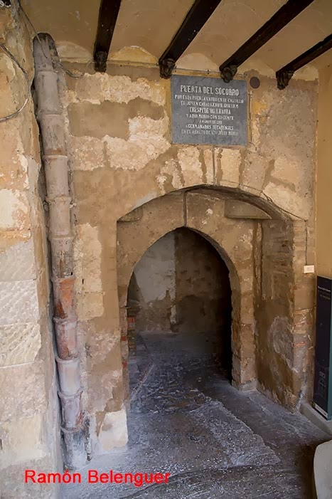 Puerta del Socorro construida en el siglo XIV, que en caso de asedio permitía la comunicación con el exterior a través del valle de Bixquert. En ella se vivieron los episodios más sangrientos durante las revueltas de las Germanías con la muerte el 14 de julio de 1521 por parte de los agermanados de don Luis Crespí de Valldaura, señor de Sumacárcel y de Alcudia, famoso noble valenciano
