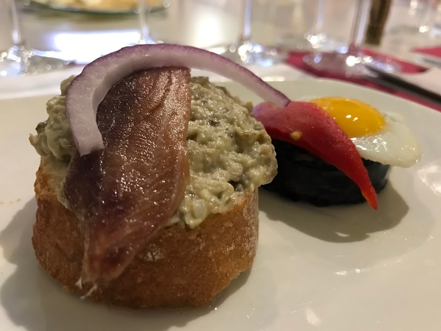 Y al acabar la cata, durante la cual estuve intercambiando impresiones con el resto de bloggers y profesionales de la comunicación presentes, Divina Comedia nos preparó un picoteo, con queso de Almedíjar (brutal es poco), jamón ibérico y una tapa de cremoso de berenjena con anchoa y morcilla de arroz con huevo de codorniz. Y ahí me rendí a la evidencia de que no hay nada mejor que una copa de vino tinto con un buen queso curado.