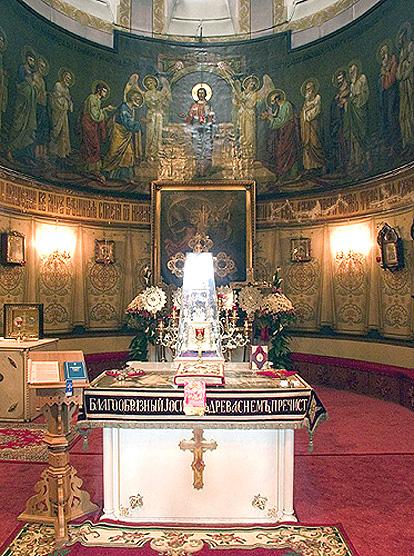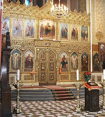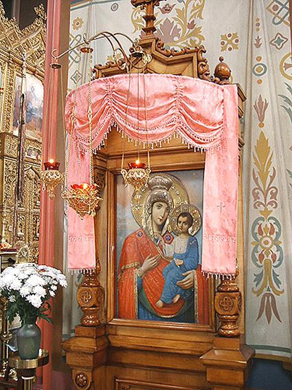 El interior hace confundirnos; las iglesias ortodoxas tienen esa cualidad o esa debilidad, todas por dentro son tremendamente ricas e iguales. Vemos una representación de Nuestra Virgen del Socorro aunque aquí como es preceptivo no es imagen sino pintura, pues no puede representar a ningún personaje sagrado en más de una sola dimensión.
