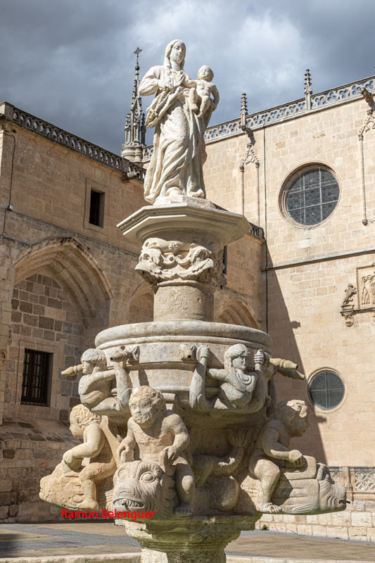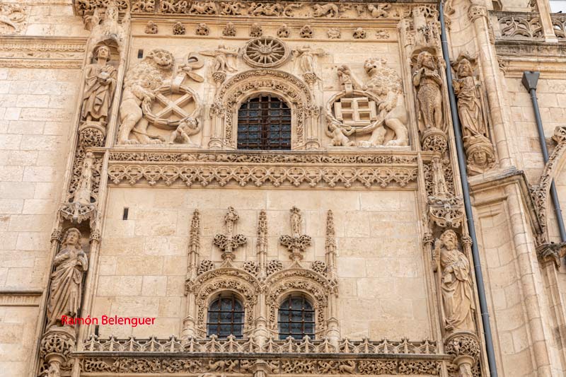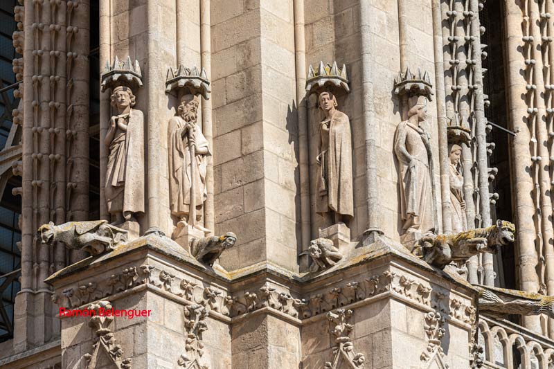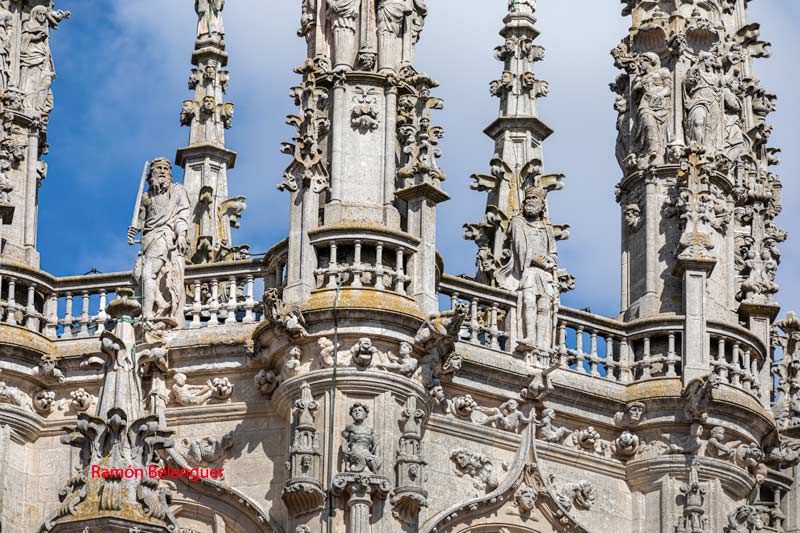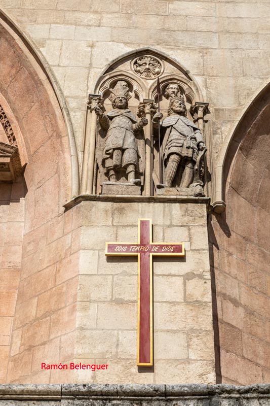 · Entre el segundo y el tercer cuerpo se halla la galería de los reyes, que bien podrían ser reyes castellanos o personajes bíblicos relacionados con la Virgen. Las imágenes originales fueron trasladadas al interior, en concreto al claustro bajo, por el peligro de deterioro que suponía su exposición constante a los agentes atmosféricos. Las que aquí se exponen son reproducciones.
